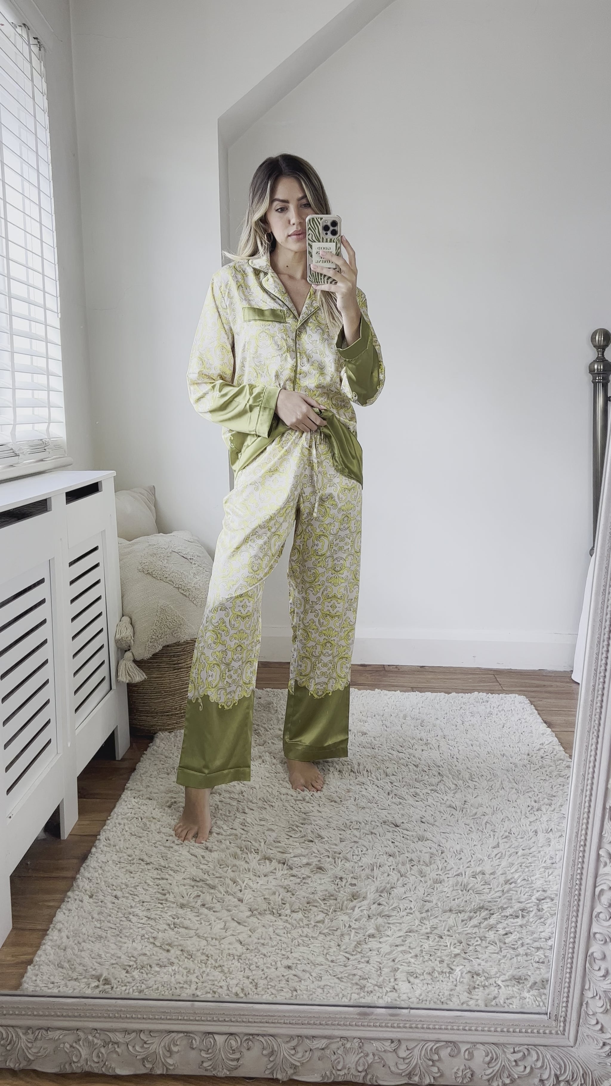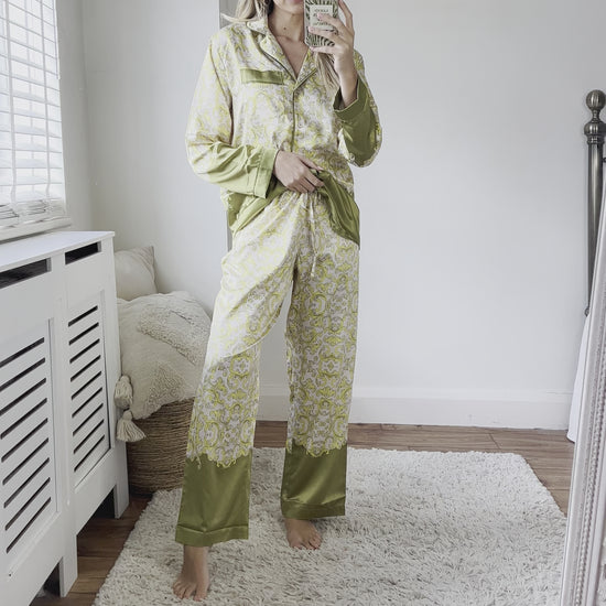 The Jessie Loungewear Set in our Grey printed satin comes in a regular and a tall fit. It is super comfortable and can be worn casually or dressed up for an event with statement heels and a clutch bag. This outfit can equally be worn with a bikini underneath for a relaxed beach party look.