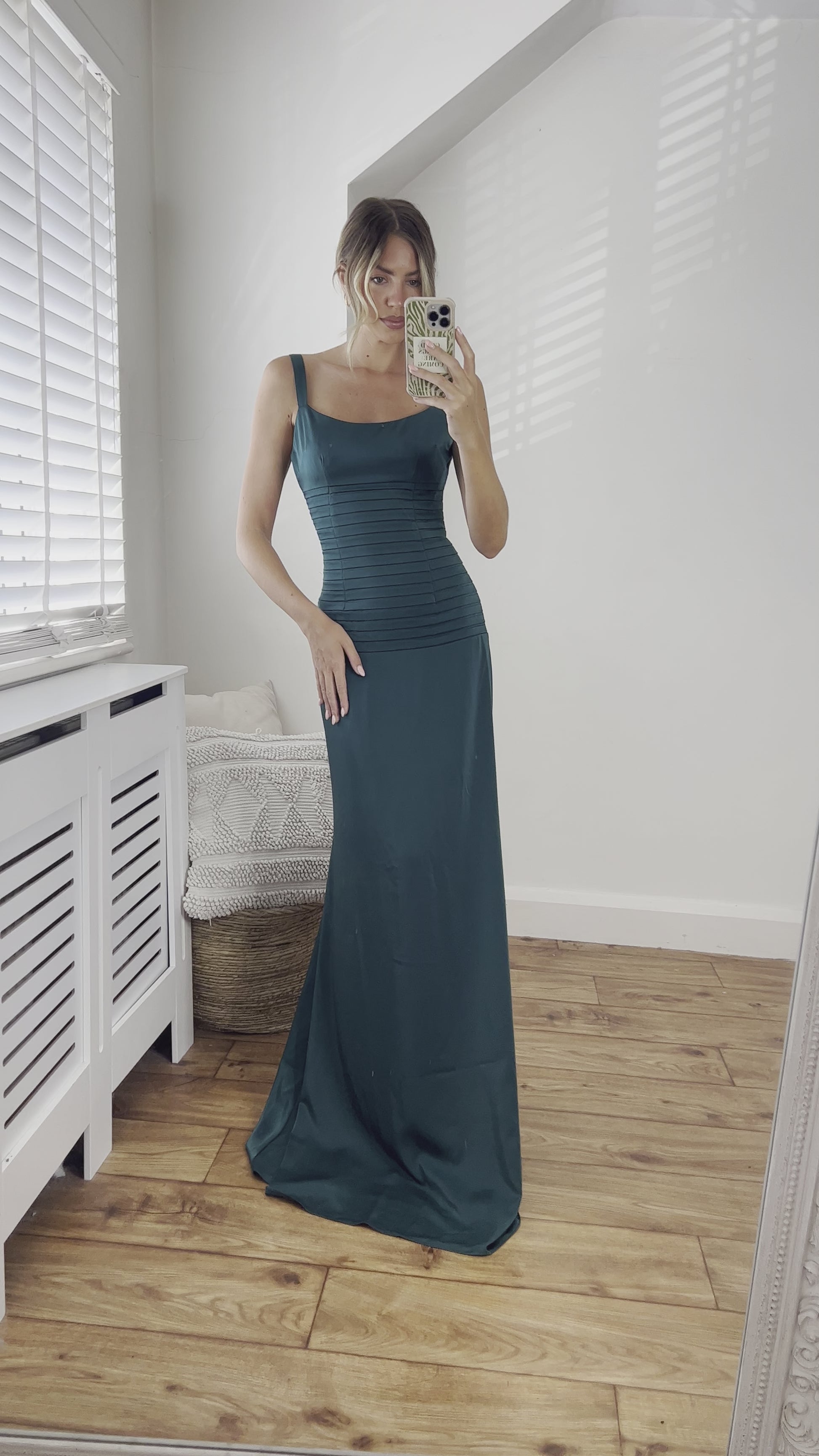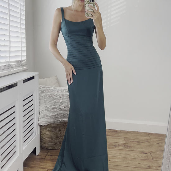 Our Catherine Fitted Corset Premium Satin Pin-tuck Design Lace Up Back Full Length Dress in Emerald Green. This Dress is cut from Premium Satin and has a structured corset style top with satin ties which can be cinched in from the back. This Dress has a fitted silhouette and is sweeping floor length. It has structured straps wide enough to hie a bra.