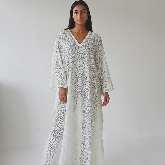 This stunning Kaftan is made from Chantilly lace with a full inner slip for coverage. Ruched at the waist by 2 side Botton to highlight and shape the waistline. The scalloped eyelash trims are so pretty and delicate. This cream Kaftan is accompanied by a matching scarf and it is Perfect for all occasion.